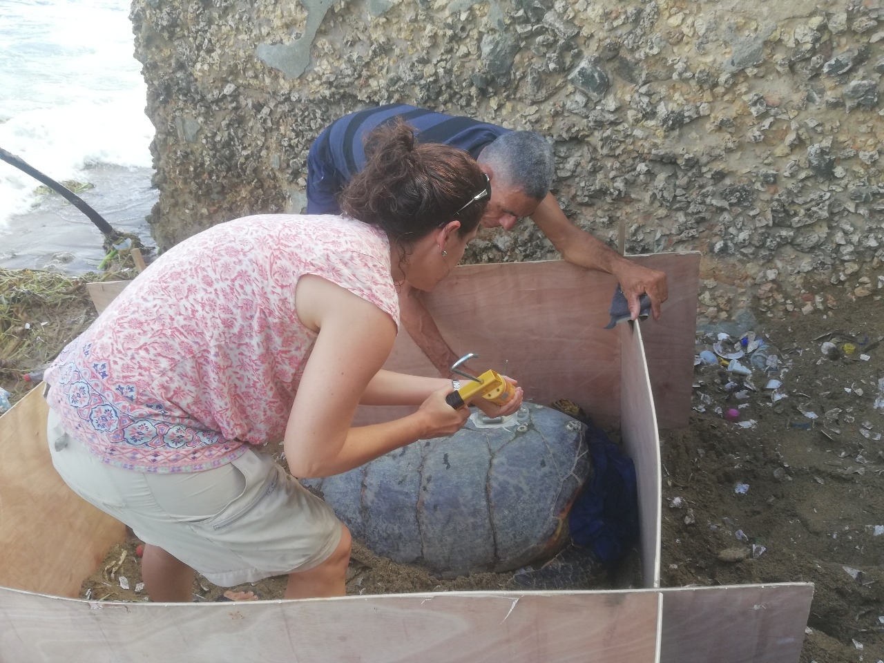 Esta tortuga Carey decidió anidar en un lugar poco usual de la ciudad de Santo Domingo, una pequeña playa que se forma al final de la Av. Máximo Gómez.