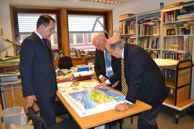 En la foto: El Presidente de la ANAMAR, Ing. Pascual Prota Henríquez en compañía del Embajador dominicano en UK Federico Cuello da explicaciones sobre el mapa topobatimétrico al Sr. Peter Barber, Jefe de Cartografía y materiales topográficos de la Biblioteca Británica (British Library).